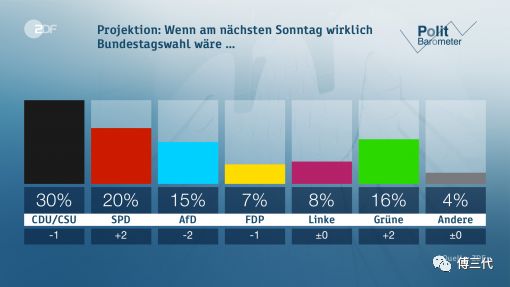 CDU是中间偏右的基督教联盟,简称基联盟,很多中国人狂骂的“圣母婊”默克尔就是该党主席,已经当了很多年的总理。在这次调查中下降一个点。SPD是德国社会民主党,中间偏左,这次调查上升了两个点。
